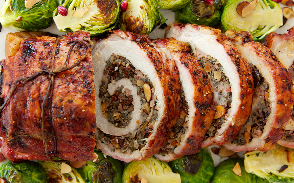 Large boneless pork loins stuffed two different ways: Wild rice, white rice and mushrooms in a light butter sauce (baste with cream of mushroom soup) or bread stuffing, apples, almonds, and a unique Jamaican spice (baste with apple juice). Bake thawed @ 350° for 60-75 minutes. 2 roasts